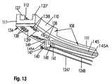 Referring again toFIGS. 154 and 155 of the drawings under circumstances where it is desired to manipulate the tubular forkedblade device300 into position for suturing in a wound or incision, positioning of theneedle50 to the desired location can be effected by tensioning one of the threecables396. Thecables396 extend in radially spaced-apart relationship throughcorresponding cable holes396A,396B and396C, respectively, provided in the outertubular extension364A, illustrated inFIG. 155, to a suitable operator (not illustrated). The opposite ends of thecables396 are attached to the firstflexible tube section360C of a series offlexible tube sections360C-360L, as illustrated inFIG. 154. Accordingly, tensioning of a selected one of thecables396 facilitates bending of the outerflexible tube360, including the outertubular extension364A, as well as the middletubular extension364B and the innertubular extension364C in concert, as illustrated inFIG. 154, typically to the position illustrated in phantom. In a preferred embodiment of the invention theflexible tube sections360C-360L are constructed such that they typically operate as a “gooseneck” device, such that positioning of the tubular forkedblade device300 in a desired position for suturing by theneedle50 is maintained after adjustment of therespective cables396, by friction between the respective adjacentflexible tube sections360C-360L.