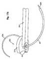 Referring now toFIG. 175 of the drawings in yet another drive mechanism for operating theflexible rotor device500, therotor shaft516 is connected to aspindle519 in arotary cable circuit518 that connects thespindle519 to adrive spindle519A, rotatably mounted between a pair of mount blocks525. An endless belt orcable521 is wound on thespindle519 and thedrive spindle519A and aratchet520 and aratchet pawl520A are provided on the bottom end of thespindle519 to facilitate driving of thespindle519 in one direction and preventing reverse rotation of thespindle519. Aspindle bevel gear524 is provided on the bottom of thedrive spindle519A and thespindle bevel gear524 engages adrive bevel gear524A, connected to the shaft of amotor523. Accordingly, operation of themotor523 causes thedrive bevel gear524A and thespindle bevel gear524 to rotate, thereby rotating thedrive spindle519A and, through operation of theendless cable521, thespindle519 also rotates, to effect a corresponding rotation of theflexible rotor515 and theneedle50 in thedisc510 of theflexible rotor device500. Themotor23 can be typically equipped with arotation counter526 for tracking the number of suturing cycles of theneedle50 and acutoff switch527 and areversal switch528 may also be provided in a rotary cable circuit529. It will be understood by those skilled in the art that other operating mechanisms known to those skilled in the art may be used to effect rotation of theflexible rotor515 and theneedle50 in theflexible rotor device500, as desired. It will be further appreciated from a consideration ofFIG. 175 that therotary cable circuit518 can be housed in a suitable operator such as the operator described in other embodiments of this invention, as desired.