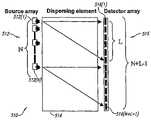 The term source is used broadly herein to refer to any device or combination of devices and/or structures that emits a sample to be tested, or emits a probe in any form which is employed to interrogate a sample or samples, such as particles (e.g., ions) or waves (e.g., electromagnetic radiation of various wavelengths or sound). The term refers to single or individual sources as well as to arrays or assemblies of multiple sources and particularly to spatial defined arrays or assemblies of sources. The sample emitted by a source can be in any form, e.g., a gas, liquid (e.g., spray), or particles (e.g., ions, aerosol particles, etc.). The sample may contain one or more components to be tested, optionally in the presence of components that are not to be tested (e.g., solvents) and optionally in the presence of one or more components present in defined amounts or having defined properties to be used as standards. Probe waves emitted by the source include waves such as x-rays, infrared radiation, visible radiation, microwaves, etc. The source may be an array of ion sources for use in mass spectrometric analysis. The source may, emit electromagnetic radiation in a spatially defined manner, for example, by passing radiation emitted by one or more sources through a spatially defined array of slits, or other apertures to generate a spatially defined array of sources of that radiation. It is generally preferred in the spatially defined source arrays or assemblies of this invention that the plurality of sources in the array emit samples or probes that are similar in intensity (e.g., for radiation) or amount. The more similar the sources in an array are in such properties, the higher the signal-to-noise ratio of the analytical measurements made using the array of sources will be.
