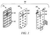 FIG. 5 illustrates an exploded view of an exemplary keycap assembly layer500 comprising akey cap layer510, and aflexible web520 applied to a backside of the key cap layer. In one embodiment, the key cap layer including the plurality of user interface key caps flexibly coupled to the carrier is formed from a single sheet of material, for example, stainless steel, or aluminum, or phosphor bronze, or copper alloy or some other suitable metal material. In one exemplary embodiment, the key cap layer is grade SS304 stainless steel. In other embodiments, the key cap layer is formed of a synthetic or composite material with suitable rigidity and flexibility characteristics. In some embodiments, the plurality of key caps are defined by forming the spaces in a stamping process or in some other material removal process, for example, by chemical or laser etching, high velocity fluid cutting, etc. In other embodiments, the key caps are formed in a molding or casting or some other fabricating process. In one embodiment, the key cap layer is not more than 1.5 mm thick, and in an exemplary super-thin keypad application the key cap layer is between approximately 0.2 and approximately 0.3 mm thick. These exemplary ranges however are not intended to be limiting. Other exemplary ranges are discussed below.