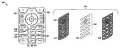The exemplarykey cap layers200 and300 ofFIGS. 2 and 3 comprise key caps including artwork apertures. The exemplary artwork apertures include alphanumeric characters and other functional symbols suitable for use in a communications device application. In some embodiments, the key cap backing material covers or fills the artwork aperture. In one embodiment, the backing material is a clear or tinted translucent material that permits light to emanate from a luminescent layer disposed below the key caps as discussed further below. According to a related aspect of the disclosure, the backing material disposed in the artwork aperture may be used to capture portions of the artwork that would otherwise require support structure or be susceptible to dislodgement. These captured artwork portions include, for example, the center portions of the numerals “0”, “4”, “6”, “8” etc. A tactile interface may be formed on some or all of the key caps as discussed above or by allowing some of the backing material to protrude through the artwork aperture beyond the surface of the key cap. The tactile interface may also be produced by embossing or by an intaglio process.