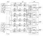 Selector network118 shown inFIG. 5 allowed four beams to be individually allocated between phasedarray antenna apertures14 and16. For example, all four beams could be allocated toaperture14 or toaperture16. Alternately, one, two, or three beams may be allocated toaperture14 or aperture16 (so long as the sum of the allocated beams does not exceed four). In contrast,selector network118 constrains beam allocation to particular groups of beams. As shown inFIG. 6,network selector118 includes 2-way power dividers178-188 to constraint beam allocation to groups of two. For example, four beams (two groups of two beams) may be allocated toaperture14 or toaperture16. In another example, one group of two beams (e.g., beams1 and2) may be allocated toaperture14 and another group of two beams (e.g., beams3 and4) may be allocated toaperture16.Selector network118 may be extended to allocate more individual beams or groups of beams. For example, from a pool of N beams (e.g., sixteen beams, thirty-two beams, forty-eight beams, etc.), a selector network may be implemented such that the N beams are flexibly allocated among phased array antenna apertures. For example, the N beams may be evenly or unevenly distributed among the apertures. During particular time periods more beams may be allocated to a particular aperture to provide needed coverage for increased signal traffic. Along with allocating beams individually, beams may be allocated in groups that may or may not be constrained to one group size. For example, groups of one, two, three, or four beams may be designated for allocation. Furthermore, multiple group sizes may be implemented that may be similar or dissimilar in size. Along with constraining beam groups to a particular number, grouping may also be constrained by one or more other parameters. For example, beams may be grouped by frequency band (e.g., C-band, Ku-band, etc.), polarization (e.g., liner vertical, linear horizontal, right hand circular, left hand circular, elliptical, etc.), or one or more other parameters.