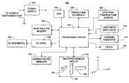 Magnetic sensor circuit102 may be of any conventional construction modified to provide the output from additionalmagnetic sensor108, where applicable. The magnetic sensor circuit may utilize flux gate, magneto-inductive, magneto-impedance, or magneto-resistive sensors. Examples of magneto-resistive sensors are disclosed in U.S. Pat. No. 5,632,092, the entire disclosure of which is incorporated herein by reference. Preferably,magnetic sensor circuit102 is constructed in accordance with any of the embodiments disclosed in commonly assigned U.S. Pat. No. 6,653,831, filed on Nov. 20, 2001, entitled “MAGNETOMETER HAVING A DYNAMICALLY ADJUSTABLE BIAS SETTING AND ELECTRONIC VEHICLE COMPASS INCORPORATING THE SAME,” by Timothy R. Friend et al., the entire disclosure of which is incorporated herein by reference. It should be noted that any microprocessing circuitry utilized in the magnetic sensor circuit may be integrated with any such circuitry inprocessing circuit110 and then appropriately programmed to perform all the necessary functions of both circuits. Alternatively, the microprocessing circuitry may be maintained separately.