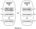 FIG. 7A illustrates a hierarchy of a senior region leaders, region leaders, and region members among multiple processing regions as used in one embodiment;