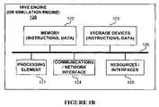 In one embodiment,hive engine120 is used as asimulation engine120 to simulate one or more hive engines, and/or one or more hive processes, tasks, or other hive functions, such as, but not limited to those disclosed herein, especially the operations, methods, steps and communication of messages illustrated by the block and flow diagrams and messages sequence charts.Hive simulator engine120 typically is used to simulate the performance and availability of hive application fabrics. The simulator allows dynamic simulation of any environment using simple text directives or a graphical user interface. For example,hive simulator engine120 can be used to determine the hive performance using particular computing hardware by specifying such things as the computer type, instantiation parameters, and connection fabric, which is used byhive simulator engine120 to produce a representation of the performance of a corresponding hive. In one embodiment, multiplehive simulator engines120 are used, such as a unique three-level, two-dimensional mode connection fabric that allowshive simulator engines120 to transmit requests uni-directionally or bi-directionally and to access otherhive simulator engines120 for subset processing while processing a request. Thus, one or morehive simulator engines120 allow for modeling at the software level, hardware level, or both levels. Additionally, ahive simulator engine120 is typically able to transmit requests through a simulated network or real hive network, such as hive100 (FIG. 1A).