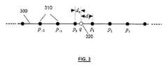 FIG. 3 shows such one dimensional image data to be interpolated. It can be either part of an image line orcolumn300, comprising pixels310 (solid circles).FIG. 3 depicts an interpolation position q320 (hollow circle) and the neighboringoriginal image pixels310 in an image line orcolumn300, that can be used for the interpolation at the given position. For the example inFIG. 3, the value N is assumed to be 6 for the giveninterpolation position320. The two closest neighboringoriginal pixels310 for the giveninterpolation position320 are p0and p1. The six pixels within the filtering range for the givenposition320 are pi, i=−2,−1,0,1,2,3. For description simplicity, piis used to refer both a pixel's location and value in the following. Similarly, q is used to refer both an interpolation position and the interpolation value at that position.