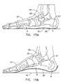 Component motions in single planes often define complex motions and include dorsiflexion and plantar flexion in the sagittal plane, adduction and abduction in the transverse plane, and inversion and eversion in the frontal plane. As shown inFIG. 3 the foot undergoes dorsiflexion when the distal end of the foot elevates toward the leg as represented byarrow36; plantar flexion is the reverse motion as represented byarrow37. Adduction is motion toward the midline of the body represented byarrow40 inFIG. 1; abduction is motion away from the midline of the body as represented byarrow41. As shown inFIG. 2, inversion is movement of the foot toward the midline of the body represented byarrow42 whereas eversion is movement of the foot away from the midline of the body as represented byarrow43.