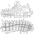 A plurality of manufacturing methods are suitable for formingmidsole32. For example,midsole32 may be formed as a unitary element, with sipes52a-52lbeing subsequently formed through an incision process.Midsole32 may also be molded such that sipes52a-52lare formed during the molding process. Suitable molding methods formidsole32 include injection molding, pouring, or compression molding, for example. In each of the molding methods, a blown polymer resin is placed within a mold having the general shape and configuration ofmidsole32. The mold includes thin blades that correspond with the positions of sipes52a-52l. The polymer resin is placed within the mold and around each of the blades. Upon setting,midsole32 is removed from the mold, with sipes52a-52lbeing formed during the molding process. The width of sipes52a-52lmay be controlled through modifications to the blade thicknesses within the mold. Accordingly, the reverse flex properties ofsipe52e, for example, may be adjusted through the thickness of the blade that formssipe52e, and the degree to which the other sipes52a-52dand52f-52lflex in the reverse direction may be controlled through the thickness of corresponding blades. A suitable width range for the blades that form sipes52a-52dand52f-52lis 0.2-0.3 millimeters, which provides a relatively small degree of reverse flex. Similarly, a suitable width range for the portion of the mold that formssipe52eis 3-5 millimeters, for example, which provides a greater degree of reverse flex.