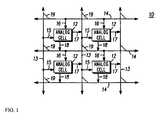 FIG. 1 is a block diagram of a programmable array using NANO-analog electronics in an integrated circuit configuration. NANO-analog array10 includes a plurality of programmableanalog cells12 arranged along a plurality of interconnect channels that form a switching network which includesbus lines13 and14 for routing analog signals. Input and output signals are transferred betweenanalog cells12 andbuses13 and14 by means of analog switching devices such as transmission gates through which analog signals can be transferred with little or no distortion. Control over the switching devices is provided by digital signals that may be stored in a memory such as random access memory (RAM) or read-only memory included in the cell. Alternatively, a centralized memory array can be used to control the switching devices in all of theanalog cells12. As a further alternative, external memory can be used if provision is made for routing the binary control signals toindividual analog cells12. As yet a further alternative, control over the switching devices may be directly provided by other digital circuitry instead of a memory array. Signal routing betweenbus13 andbus14 is provided by switchingdevices19.