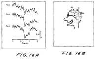 FIGS. 16A and 16B show evoked potentials test data and location of brain wave detectors for pin-prick type pain.