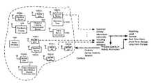 FIGS. 35 and 36 show more details about the interaction between modules in the different levels of the spectrum management system. In these diagrams, solid lines between blocks represent data flow and dashed lines represent controls.