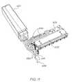 Theglue wheel assembly673 consists of a partiallyhollow axle679 with a rotating coupling for theglue supply hose641 from theink cartridge627. Thisaxle679 connects to a glue wheel, which absorbs adhesive by capillary action through radial holes. A moldedhousing682 surrounds the glue wheel, with an opening at the front. Pivoting side moldings and sprung outer doors are attached to the metal bracket and hinge out sideways when the rest of theassembly673 is thrust forward. This action exposes the glue wheel through the front of the moldedhousing682. Tension springs close the assembly and effectively cap the glue wheel during periods of inactivity.