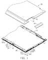 The cover unit includes afirst panel10 holding an electronic component such as a liquid crystal display (not labeled) therein, and asecond panel30. Thefirst panel10 includes a front wall11 (seeFIG. 3) and asidewall12 generally perpendicular to thefront wall11. Referring toFIG. 5, two throughholes13 are defined in thefirst panel10 adjacent thefront wall11, corresponding to thehooks228 of thelatching member22. Referring toFIGS. 1 and 3, a plurality of staggered hookingmembers14 is formed on an inside surface of thefirst panel10 adjacent thefront wall11, for engaging in thecorresponding notches221 of thelatching member22. The inside surface of thefirst panel10 adjacent thefront wall11 forms afirst stop plate16 and twopositioning rods15, corresponding to the receivingrecess222 and thesliding slots223 of thelatching member22 respectively. The inside surface of thefirst panel10 adjacent thesidewall12 forms a hookingmember17 and twopositioning rods18, corresponding to the hooking opening242 and thesliding slots244 of thepush member24 respectively. Referring toFIG. 2, asecond stop plate19 is formed on the inside surface of thefirst panel10 behind the hookingmember17 and thepositioning rods18. Referring back toFIG. 1, thesecond panel30 defines anopening31 in a sidewall thereof, corresponding to thesidewall12 of thefirst panel30. Twoconcave plates32 are formed on the sidewall of thesecond panel30 adjoining two sides of theopening31, for supporting the slidingmember35 to slide thereon.
