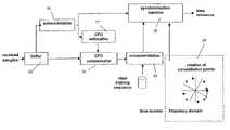 In the first synchronization algorithm only the phase jump inFIG. 5fis used to determine synchronisation. In the second algorithm, the presence of peaks above and below a certain threshold with the amplitude output ofFIGS. 5a, c, eorgplus a distance between peaks within a tolerance and the phase jump within the phase outputs ofFIGS. 5b, d, forhare used in combination to improve synchronization. The values of the thresholds may be modified in accordance with a further aspect of the present invention to improve synchronization. In the third case the detection of peaks (i.e., a local maximum or minimum) or relative thresholds is used in conjunction with the peak to peak distance within a tolerance and the phase jump. The relative thresholds may be adapted dynamically to improve synchronization. The performance of the second and third synchronization algorithms are better than using a single criterion such as the phase jump. In addition detection of the presence of plateaus may be used in either the amplitude and/or the phase outputs. In a preferred embodiment of the present invention a combination of conditions is used to determine rough synchronization, e. g. at least two selected from an amplitude peak-maximum and/or minimum, an amplitude peak above and/or below a threshold, an amplitude peak-to-peak distance, the presence of a plateau in the phase or amplitude output and a phase jump, and preferably three of these criteria as indicated in the second and third algorithms in table 1.