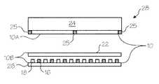 FIG. 1A is a plan view of aconductive region10A of aswitch10, as show in cross section inFIG. 1C.FIG. 1B is a plan view of aconductive region10B ofswitch10. As shown inFIG. 1C,conductive region10A is vertically aligned withconductive region10B. Asingle switch10 may be formed by vertically aligningconductive region10A withconductive region10B, as shown inFIGS. 1A and 1B, however, as is evident, a plurality ofsuch switches10 are represented inFIG. 1C, each ofsuch switches10 including aconductive region10A vertically aligned with a correspondingconductive region10B. Those skilled in the art understand thatconductive regions10A and10B, as well as switch10 (and control panel28), are not necessarily shown to scale. For example, as is evident from the description herein, one ormore spacers25, as shown inFIG. 1C, typically extend belowconductive region10A, to maintain some amount of physical separation betweenconductive regions10A and10B whenswitch10 is (electrically and physically) open, though, if desired, the one ormore spacers25 may not extend belowconductive region10A, in which caseconductive regions10A and10B may touch, even whenswitch10 is (only electrically) open.