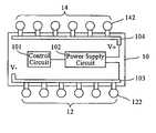 Then, seeFIG. 1B, to coat biocompatible conductive material, such as tantalum, stainless steel and titanium, on the extending parts of thecathode electrodes122 and theanode electrode142 from theflexible circuit board10. Then, seeFIG. 1C, using a biocompatible polymer layer16 to cover the entireflexible circuit board10, and only expose parts of thecathode electrode array12 and theanode electrode array14. The biocompatible polymer layer16 can be silicone, PTMS (poly(tetramethylene succinaze)) and PMMA (poly(methylmethacrylaze)). Moreover, before using the biocompatible polymer layer16 to cover the entireflexible circuit board10, black epoxy (Glass Transition Temperature Tg>60° C.) can be used to bury electric components on the flexible circuit board, such as the connective legs of the electric components on thecontrol circuit101 andpower supply circuit102, the cathodeconductive wire103 and the anodeconductive wire104, to enhance insulation, and then biocompatible polymer layer16 covers the entireflexible circuit board10.