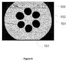 In another example of this process, the stack is inserted into a tube before drawing in each stage of a two-stage process. Additionally, an extra step can be used to fuse the stack and the tube prior to drawing. The tube may then be totally or partially removed by grinding or etching. Additionally, the doped rod is incorporated into a core region of a large core fiber. Such a fiber may be fabricated by stacking the doped core together with undoped rods as well as with hollow (undoped) rods and drawing. A cross-section of afiber500 thereby produced is shown inFIG. 6. Thefiber500 includes 6holes502, which defines acore501. The 6 holes may be formed from six hollow rods used in the drawing process. Other processes and configurations may be used. The doped part of thecore503 comprises the doped rods fabricated by the repeated stack-and-draw process such as described above with regard toFIGS. 4A and 5A, which shows first and second stacks, respectively. Each of the rods used in the second stack are visible because the optional silica tube used in the first stack has slightly lower refractive index than that of the ytterbium-doped glass.
