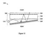 FIG. 13 is a cross-sectional view of a seventh shutter-based spatiallight modulator1300 according to an illustrative embodiment of the invention. The seventh shutter-based spatiallight modulator1300 includes asubstrate1302 on which alight modulation array1304 is formed, and alight guide1306. Thelight modulation array1304 includes a front reflective surface for theoptical cavity1310 of thespatial light modulator1300. A reflective material is deposited or adhered to the rear side of the light guide to serve as a rearreflective surface1308. The rear side of thelight guide1306 is angled or shaped with respect to the front side of thelight guide1308 to promote uniform distribution of light in thelight modulation array1304. The rearreflective surface1308, however, is still partially facing the front reflective surface.