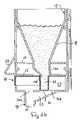 Flow passageway19 of thecontainer holder12 is more particularly illustrated inFIGS. 6a-6d. As shown inFIG. 6a, for example,flow passageway19 is open at the bottom19a, and includes a front wall19bwhich converges towards therear wall19c. The lower edge of the converging front wall19bis sharpened, as shown at19d, to provide a relatively sharp scraping edge engaging thetop wall33,34, of the twodosing devices30,40, as they move between their forward and rearward limit positions. A partition19e(FIG. 3) divides itsoutlet passageway19 into two sub-passageways, one alignable withdosing compartment39 ofdosing device30, and the other alignable withdosing compartment49 ofdosing device40.