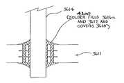FIGS. 41C and 41D show a side view of theopening3616. Theopening3616 is preferably coated or plated with copper, illustrated by the dark lines on theinner surface3616ainFIGS. 39B and 39C. This coating is referred to as thru-hole plating. As illustrated by the dark lines, thevias3617 are also coated with thru-hole plating3617a, preferably also made of copper, e.g., to provide an electrical connection between layers on a printed circuit board.