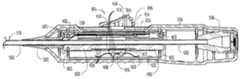 Thesecond tube902 has an inner diameter slightly larger than the outer diameter of thefirst tube900 to permit sliding movement between thetubes900,902 throughout a range of travel of thecarriage assembly406 in thehandle assembly150. Thesecond tube902 substantially prevents lateral movement of thefirst tube900 because of the tight tolerances between inner diameter and outer diameter of therespective tubes900,902. Thefirst tube900 extends through a portion of thesecond tube902. Thesecond tube902 has a sufficiently small inner diameter to substantially prevent buckling of theflexible element120 where theelement120 exits thefirst tube900 and is received within thesecond tube902. As shown inFIG. 9, the second tube has acurved portion904, in another option. The small inner diameter of thesecond tube902 constrains theflexible element120 and permits movement of theelement120 through thecurved portion904 according to the path defined by the inner diameter of thesecond tube902 in theportion904.