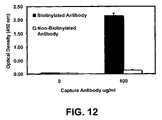 Binding Results: Results are presented inFIG. 12. The data illustrates that in the absence of the first layer capture antibody (capture antibody concentration=0), the non-specific binding of the detection antibody (anti-goat, HRP) is very low (open bars). On surfaces incubated with the goat antibodies, results show that only the biotinylated antibody gives significant signal (solid bars). These results demonstrate that the surface embodiments of the present invention are selective for biotinylated antibody.