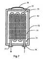 FIG. 7 depicts in schematic form thethermal battery42.Thermal battery42 consists ofhousing72,heat exchanger71 consisting ofheat exchanger tube75 and optionallyheat exchanger fins74, fluid inlet fitting76, fluid outlet fitting77, coolingmedium73, and handle78.Housing72 containsheat exchanger71 and coolingmedium73 and is molded from a polymer such as high-density polyethylene. Coolingmedium73 is a liquid solution or water, which has the property of freezing and melting at a constant temperature.Heat exchanger71 consists of a length ofheat exchanger tube75, which provides a fluid path for saline68 (FIG. 6) internal tohousing72 whereheat exchanger tube75 is surrounded by and in thermal contact with coolingmedium73.Heat exchanger tube75 may be constructed from stainless steel tubing and has an inner diameter between 0.25 inches and 0.5 inches, and has a wall thickness between 0.005 and 0.020 inches. The shapeheat exchanger tube75 may be serpentine as shown, or some other shape. The straight-line length ofheat exchanger tube75 is between 12 inches and 120 inches. Metalheat exchanger fins74 may be bonded toheat exchanger tube75 to enhance heat transfer from cooling medium73 to saline68 (FIG. 6) as it passes throughheat exchanger tube75.Housing72 is constructed so thatthermal battery42 functions as a cassette and may be placed into, and removed from console2 (FIGS. 1,2 &6). Console2 (FIGS. 1,2, &6) is designed to receivethermal battery42 as a cassette and is configured to provide easy user access tothermal battery42, and is configured to provide thermal insulation tothermal battery42 to prevent absorbsion of ambient heat. Fluid inlet fitting76, and fluid outlet fitting77 provide fluid connection to console2 (FIGS. 1,2, &6) and mate with receptacles inconsole2.Handle78 facilitates placement and removal ofthermal battery42 fromconsole2.Thermal battery42 is charged by placingthermal battery42 into a freezer for a period of time sufficient to convert cooling medium73 from a liquid state to a solid state. Coolingmedium73 reverts back to a liquid state during use in patient cooling by absorbing heat from the patients body as transferred to thethermal battery42 by circulation ofsaline68 as previously described. Coolingmedium73 is formulated to freeze and melt at a temperature between −15 and +10 degrees centigrade. Coolingmedium73 may be a solution of salt water, or a solution of water and another substance, or may be water.Thermal battery42 contains between 1 and 10 pounds of coolingmedium73, and provides for patient cooling for a duration of between 15 and 240 minutes.