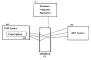 FIG. 2 illustrates a third party application integrated with aCRM system200 through the use of abusiness integration application201, such as Microsoft BizTalk. In this situation, an integration application will provide aninterface202 that may map parameters of aCRM function203 to athird party component204 so that the components may communicate with one another. In this model, in order to extend a CRM application, one may actually need to expose the CRM's objects in order to communicate with external components. Often times, CRM systems may only allow components that implement CRM object types. This may make components difficult to integrate, even with robust integration tools. This complex mapping process may not be suited for an average business developer who is only interested in defining an extension of a CRM task.