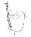 FIG. 7 shows an embodiment of the invention wherein the hose member is connected to a reservoir for collection of liquid substances, e.g. for collection of urine and/or a saline solution having been used for establishing a low friction surface character of the catheter prior to use. Thevalve70 may preferably be provided as a one-way closure, so as to ensure that liquids drained into the reservoir does not flow back through the hose member and/or through the catheter. The reservoir is provided with a draining spout orvalve71 for draining the liquid substances out of the reservoir. As an example, the draining valve may be opened by tearing off a top part of the valve. For this purpose the reservoir may preferably be provided with a weakeningline72. The reservoir may preferably be formed as a bag with a substantially flatbottom part73. Thereby it will be possible for the user to leave the reservoir on a flat surface, e.g. on the floor, while the catheter is inserted into the urethra and while urine is drained into the reservoir. Instructions relating to the opening of the draining valve may preferably be printed on the reservoir. Thehandles74,75 give the user a better grip, e.g. when emptying the reservoir. For this purpose, it will be specifically appropriate to use both handles in combination, so that the reservoir is lifted in the top handles75, while therear handle74 is used to rotate the reservoir. In this respect, it should be kept in mind that the user would typically be at least partly motorically disabled. The assembly further comprises aclosure76 for opening and closing the assembly, respectively. In the embodiment ofFIG. 7, thecompartment77 is joined telescopically to thehose79 via the joint78.