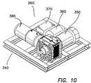 FIG. 9 shows the counterweight assembly220-1 within the confines of the truss section200-1. The counterweight assembly220-1 is slidably engaged toparallel tracks335 which extend the height of the truss section200-1.Cables250 and255 are attached to an upper portion of the counterweight assembly.Cables250′ and255′ extend from underneath the counterweight assembly220-1.