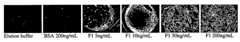 FIG. 4 is a digitized image taken with cross polar filters (0 degrees). In top row are elutions from beads treated contacted with 20% CS with no additional wash, SDS wash, and a 0.1M glycine pH 4.0 wash. In the lower row are elutions from beads contacted with 20% CS+F1 50 ng/mL with no additional wash, SDS wash, or a 0.1M glycine pH 4.0 wash.FIG. 5 presents the results of the same experiments as analyzed with a polarized microscope. The digitized images were taken by polarized microscope where the polaroid filters are cross polar at 0°. The order of the treatments is the same as forFIG. 4.