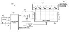 A block diagram illustrating the DPA with multiple transistor banks is shown inFIG. 23. In this alternative embodiment, the modulation circuit, generally referenced340, comprises aDCO342,control unit358, a plurality ofswitch matrixes356,354,352, a plurality oftransistor arrays344,346,348 andmatching network350. The switch matrix structure and transistor array are split into several parallel structures due to the fact that it is difficult to control large (e.g., N=1024) column size at high speed. In the example embodiment described herein, the switch matrix structure and transistor array are split into three portions as follows: (1) a matrix and array adapted to handle large dynamic range but low slowly varying signal, (2) a matrix and array adapted to handle small dynamic range but quickly varying signal, and (3) a matrix and array adapted to handle very small dynamic range but ultra fast varying signal. The underlying principle is that the modulating data is bandwidth limited. Consequently, a large range is needed for the slowly varying signal component and a fast varying signal component has a limited range. The ultra-fast component is typically not dictated directly by the data, but by other techniques, such as ΣΔ dithering to improve the resolution.