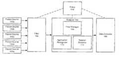 This paragraph lists the elements ofFIG. 1 and describes their interconnections.FIG. 1 includes the packet sources100a-e, afilter102, ananalyzer104, adata collector106, apolicy114. Theanalyzer104 includes aflow manager108, anapplication recognizer110, and asession streamer112. The packet sources100a-eare coupled in communication with thefilter102. Thefilter102 is coupled in communication with theanalyzer104. Theanalyzer104 is coupled in communication with thedata collector106. Thefilter102, theanalyzer104, and thedata collector106 are capable of accessing thepolicy114.