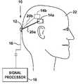 Resulting from the inclusion ofamplifier component38 inreference electrode module12, electrical potentials detected by electrodes14 will be passed intoamplifier component38 for signal amplification. The use of short lead wires20 (usually less than 15-20 cm in length on an adult human's head and even shorter on an infant's or small animal's head) results in far less noise being inductively or capacitively coupled to the lead wires that carries the signal from electrodes14 to theamplifier component38 than conventional electrode-lead and wire-amplifier arrangements. Additionally, since lead wires20 are preferably taut, motion artifacts that induce noise in the lead wires20 as they move through static (i.e., time invariant) electromagnetic fields are significantly reduced. The motion artifact noise is significantly reduced compared to known arrangements sincelead wires20aand20bare likely to move through very similar paths and remain fixed relative to each other through these time-invariant electromagnetic fields. Consequently, there is likely to be only very small differential potentials resulting from these differential motion artifacts that will be detected byamplifier component38.