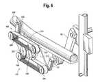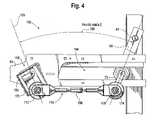 The preferred embodiment of thestride adjustment mechanism166 shown inFIGS. 4 and 5 takes full advantage of the relative rotation between thecrank extension72 and acontrol link assembly170 of thestride adjustment mechanism166 as the user moves thepedals12. In this embodiment,attachment adjustment mechanism166 includes thecontrol link assembly170 and two secondary crank arms, the link crankassembly168 and thecrank extension72. Thecontrol link assembly170 includes a pair of driven timing-pulley shafts172 and174, a pair of toothed timing-pulleys176 and178 and a toothed timing-belt180 engaged with the timing pulleys176 and178. For clarity, the timing belt is not shown inFIG. 4 but is shown inFIG. 5. Also included in the link crankassembly168 is a link crankactuator182. One end of the crank-extension72 is rigidly attached to themain crank68. The other end of the crank-extension72 is rigidly attached to the rear driven timing-pulley shaft174 and thepulley178. Also, the rear driven timing-pulley shaft174 is rotationally attached to the rearward end of thecontrol link assembly170. The forward end of thecontrol link assembly170 is rotationally attached to the forward driven timing-pulley shaft172 andpulley176. The two timing-pulleys176 and178 are connected to each other via the timing-belt180. The forward driven timing-pulley shaft172 is pivotally attached to the link crank168, but held in a fixed position by the link crankactuator182 when theactuator182 is stationary; the link crank168 operates as if it were rigidly attached to the forward driven timing-pulley shaft172. The other end of the link crank168 is pivotally attached to thepedal lever50 at thepivot axle169. As an alternative to directly connecting the a link crankmechanism168 directly to thepedal lever50, a method of attachment to reduce the effects of misalignment can be used such as a compliant mountingassembly183 as shown inFIG. 18. In this case, the compliant mountingassembly183 includes a number of resilient components indicated at185 secured between a pair ofsupport plates187 that absorb and compensate for any misalignment between the main crank68 and thepedal lever50. In this particular embodiment of theelliptical step apparatus10 shown inFIGS. 4 and 5, the main crank68 via a revolute joint on a linear slot supports the rearward end of thepedal lever50. Here, this is in the form of a roller & track interface indicated generally at184. When theapparatus10 is put in motion, there is relative rotation between the crank extension/rearward timing-pulley178 and thecontrol link170. This timing-pulley rotation drives the forward driven timing-pulley176 via the timing-belt180. Since the forward driven timing-pulley176 is rigidly attached to one end of the link crank168, the link crank168 rotates relative to thepedal lever50. Because thecontrol link170 is a rigid body, the rotation of the link crank168 moves thepedal lever50 in a prescribed motion on itssupport system184. In order to facilitate installation, removal and tension adjustment of thebelt180 on thepulleys176 and178, thecontrol link170 includes an adjustment device such as a turnbuckle186 that can be used to selectively shorten or lengthen the distance between thepulleys176 and178.