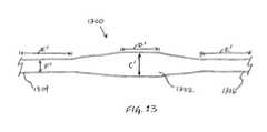 FIG. 13 illustrates another embodiment of the present invention including animplant1300 defined by asupport portion1302 withanchor portions1304,1306 extending in opposing directions therefrom. This embodiment includes a support portion with a width C′ of approximately 1.65 cm and a length D′ of approximately 2 cm.Anchor portions1304,1306 may extend fromsupport portion1302 via a tapered segment (as shown) and will have a length E′ of approximately 20.25 cm and width F′ of approximately 1.1 cm. However, one skilled in the art would understand that the specific dimensions provided herein may be modified and still remain within the scope and spirit of the present invention.