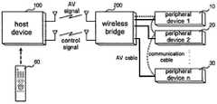 When a user inputs the key code of aremote control60 to thehost device100 by using one integratedremote control60, thehost device100 sends a control signal according to the key code to thewireless bridge200 and thewireless bridge200 sends the control signal to peripheral devices through the communication cable according to the control signal. Then, the peripheral devices having received the control signal perform corresponding operations and input video signals and/or audio signals to thewireless bridge200 through the AV cables or the communication cable. Thewireless bridge200 generates an AV signal having a predetermined packet structure from the inputted video signal and/or the audio signal and transmits the generated AV signal to thehost device100 through a wireless medium. Then, thehost device100 restores a video and/or audio from the inputted AV signal and outputs the restored image and/or voice through an AV output unit.