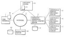 The contents additional service inquiry server stores the information of the additional service provided by the contents center and the location information of its provider, and the information of the additional service provided by the other third party and the location information of its provider, in a form that distinguishes them.