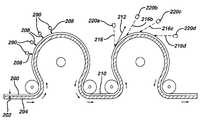 As will be recognized by those of skill in the art, and as illustrated in the Figures, an overall machine direction212 (depicted inFIG. 2 at various points in the process by a solid arrow) may vary relative to the contacting apparatus, depending upon the location of theweb210 on the apparatus. For the purposes of the contacting step herein, the machine direction is the direction in which that portion of the stabilized web being contacted with a stream of liquid is primarily moving, relative to the contacting apparatus (machine), at the time when it is being contacted with the stream during the contacting step.