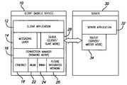 In an alternative embodiment of the invention, the portable communication client further comprises an intelligent queuing system (or IQueue). The queuing system includes a client-side queue (i.e., client/slave mode) and a server-side queue (i.e., server/master mode). The server-side queue may be communicating with multiple client-side queues. Referring now toFIG. 2, a block diagram illustrates a connection between aclient10 and aserver30 in accordance with the alternative embodiment of the invention. In addition to the architecture described above with respect toFIG. 1, theclient10 includes client-side queue28 and theserver30 includes server-side queue34. Communications between theclient10 andserver30 pass through the queuing system. Theconnection manager16 notifies the client-side queue28 when a network connection is available (or lost) and the cost associated with that connection. The client-side queue28 will then establish a connection to the server-side queue34 through the selected network. Upon the establishment of the initial connection, the queues exchange various information including connection cost data. If theconnection manager16 determines that there is a network connection available, data is transferred between the queues and passed on to the destination application (i.e.,client application12 or server application32). If there is no network connection available, or the cost of the connection exceeds the value of the data, the data is queued until a network connection of the appropriate cost becomes available.