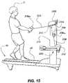 FIG. 13 shows an illustrativemovable hand controller16 and mountedconsole display218, either or both of which can include electronic controls and information displays that typically are provided on exercise treadmills for purposes such as adjusting the speed and incline oftreadmill10, the time user U has been operatingtreadmill10 and/or the time left in a set exercise regimen, user's U heart rate, the simulated load being dragged or pulled, on and off buttons, and an emergency off button, and other functions. A number of visual displays can be included onhand controller16 andconsole display218 including time display that displays the elapsed time of an exercise regimen or the time remaining in a count down for an exercise regimen, heart rate display that shows the heart rate of user U assuming a heart rate monitor is being used andtreadmill10 include the features of heart rate monitoring, incline display representing the incline ofbelt20 in degrees or other units, load display representing the load or weight being dragged or pulled, and speed display representing how fast user is moving. Such displays are known in the treadmill art.