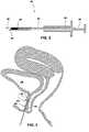 FIG. 3 is a sagittal cross section of genitourinary region of a female patient, showing a technique for implantation of a bulking prosthesis with a needle such as the needle shown inFIG. 2.