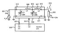 where ω is 2π×frequency at which the impedance matching is performed. If theadjustable capacitors504 and505 are switched-off, values C1=C2=0 are inserted in equations (15). If the capacitors are switched-off, there are actually series connections of the capacitors and parasitic capacitances of switch elements; switch elements are not shown inFIG. 5.