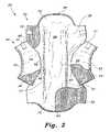 Theabsorbent core54 may be composed of a matrix of hydrophilic fibers, such as a web of cellulosic fluff, mixed with particles of a high-absorbency material commonly known as superabsorbent material such as superabsorbent hydrogel-forming particles. The superabsorbent particles may be mixed with the hydrophilic fibers. The absorbentinner surface24 may be woven or unwoven hydrophilic fibers as described above and including natural, synthetic, and modified natural polymers and materials such as cotton or cotton-like material, two or more layers of which may form theabsorbent core54.
