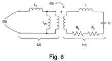 FIG. 6 shows an equivalent circuit of theantenna410 according to the present invention. Theantenna410 is comprised of two parts: amain loop610 and afeed loop620. Themain loop610 is the primary radiating element of theantenna410 and includes an inductance L and a capacitance C in series. When energized, themain loop610 resonates at a frequency determined by the values of L and C and enables the transmitting and receiving of RF signals via a radiation resistance, Rr, which is a representation of the energy delivered to radiation. A loss resistance, Rl, represents the losses in themain loop610. Themain loop610 is primarily magnetically coupled to thefeed loop620. This coupling is shown schematically inFIG. 6 by an ideal transformer T. Thefeed loop620 includes a magnetizing inductance Lm, a leakage inductance Ll, and twoends630 that connect to theRF transceiver522. Thefeed loop620 allows for the conduction of signals between theRF transceiver522 and themain loop610.