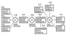 FIG. 1 is a schematic diagram of a physical configuration of an image delivery system according to the first embodiment. As shown inFIG. 1, the image delivery system is constituted by a camera server apparatus system consisting of acamera server apparatus111, adisplay operation terminal112 and afirst network113, and aconversion server apparatus114, anadvertisement server apparatus115, asecond network116, adelivery server apparatus117, athird network118 and aportable display terminal119.