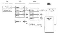 FIG. 7 illustrates an exemplary embodiment of a fourth page table.FIG. 7 illustrates a page table700. Page table700 provides an example of a page table having aroot structure702 with atop page704 referencing a first table page710 as shown by arrow708, and a table depth706 of 2. At a table depth706 of 2, first table page710-1 includes TPVs of 0 to N−1 that may reference other table pages or null references. As shown inFIG. 7, for example, page table700 includes a TPV [1] with areference712 to a second table page710-2, with the remaining TPVs having null references. Second table page710-2 may also include TPVs of 0 to N−1 that may reference data pages or null references. For example, second table page710-2 may include a TPV [0] with a reference716-1 to a data page718-1, a TPV [3] with a reference716-2 to a data page718-2, with the remaining TPVs having null references. It may be appreciated that table pages710-1,710-2 may each have a table depth of 1. There are no defined limits to page table depth, but depths greater than 3 are atypical.