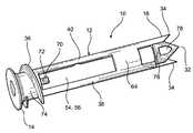 In this manner, thenut member18 will in fact be properly disposed at its first or original, axially oriented, inoperative or non-deployed position within thebody portion12 of the toggle-bolt type fastener10 so as to ensure that the tip portion of the threaded activation screw or bolt fastener, not shown, will properly engage theramp section62 of thenut member18. It is additionally seen that thecross-brace member64 comprises a rearwardly disposed or rearwardly-facing transversely orientedsurface portion66, and consequently, it can therefore be appreciated that when thenut member18 is pivotally moved to its second, transversely oriented, operative or deployed position, an undersurface orrear surface portion68 of thenut member18, within the vicinity of therearward end portion58 of thenut member18, will be moved into contact with thesurface portion66 of thecross-brace member64 such that thenut member18 will now be disposed in a position or orientation which is substantially perpendicular to the longitudinal axis of the toggle-bolt type fastener10. Accordingly, the internally threaded bore24 of thenut member18 will be able to be properly threadedly engaged by means of the threaded activation screw or bolt fastener, not shown, inserted into and through thehead portion14 of the toggle-bolt type fastener10.