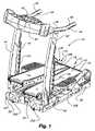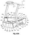 In one embodiment, eachtreadle12 has, as one of itsrollers28,30, a drive roller that moves thetread belt18 around the rollers of the treadle. In one embodiment, the drive roller is a roller with an integral motor within the roller. In another embodiment, the drive motor is secured to the treadle frame to displace with thetreadle frame52. The drive motor then powers the drive roller via a drive belt or gear arrangement. In yet another embodiment, the drive roller is powered by a motor mounted on theU-shaped frame structure972. Power is transferred from the frame-mounted motor to the drive roller via a drive belt routed around sheaves on a tension link.