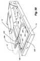 FIG. 11 is a partial cut away isometric view of the exercise device shown inFIG. 2, the view illustrating the rocker arm orientated in a position corresponding with the left treadle in a position higher than inFIG. 10 and the right treadle in a position lower than inFIG. 10.